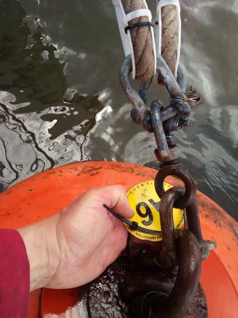 An example of a mooring setup with swivel. Note the shackle pins have been moused with wire, the eye-eye swivel could have been a size bigger, but this is sufficient for the smaller boat on this mooring.